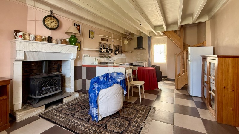 Elle se compose, au rez-de-chaussée, d'une cuisine ouverte sur un coin séjour, d'un salon/salle à manger chaleureux avec poêle à pellets, d'un dégagement desservant une chambre avec sa salle d'eau privative, des toilettes indépendantes, ainsi qu'une buanderie fonctionnelle.