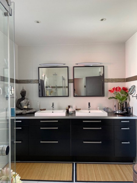 A l'étage, deux espaces nuit, une salle d'eau, un w.c et un dressing. Des espaces dissociés pour que chacun puisse avoir son intimité.